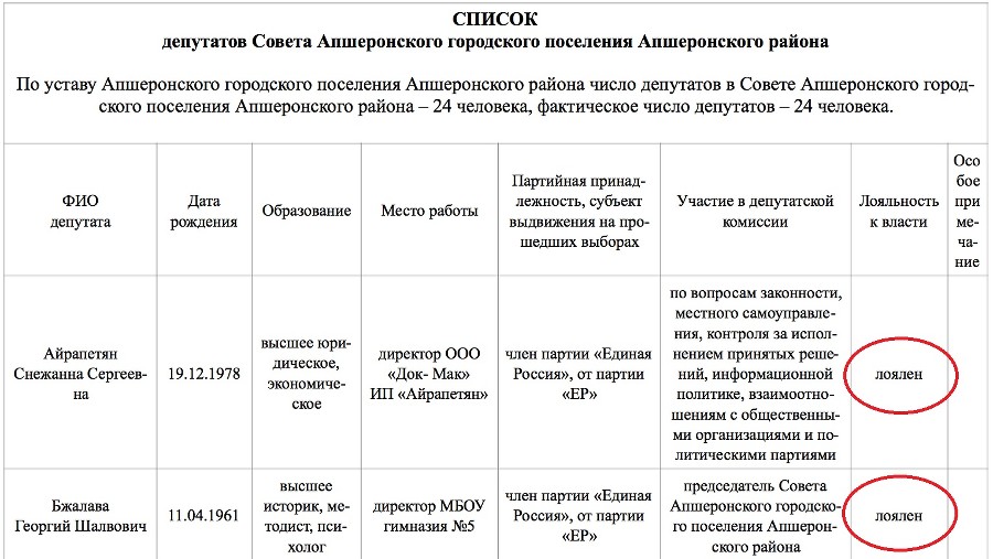 На сайте Апшеронского района разместили список депутатов в пометкой «лоялен»