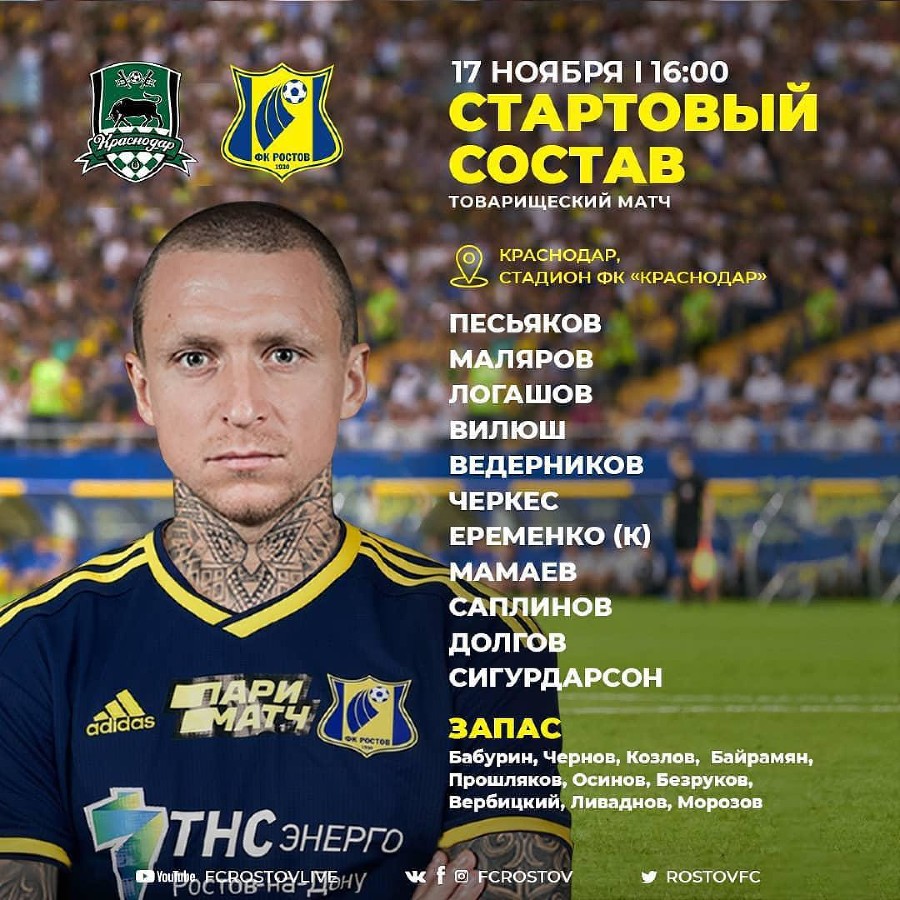 Полузащитник ФК Ростов Павел Мамаев сыграет против своего бывшего клуба Краснодар в товарищеском матче 17 ноября <img src="https://www.yuga.ru/media/63/a0/photo_2019-11-17_16-03-51__ok3q9j2.jpg" hspace="5" vspace="5" align="left" /> yuga.ru »