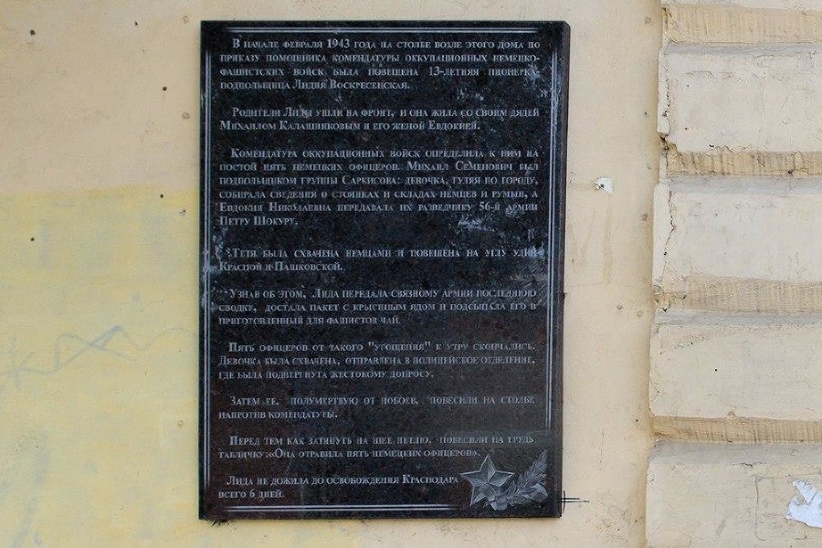 Памятную доску обновили и вновь установили на стене жилого дома по ул. им. Горького, 82. Возле этого дома во время оккупации Краснодара фашисты казнили Лидию Воскресенскую, которая отравила 5 немецких офицеров. Девочка-подросток была участницей партизанского движения. krd.ru »