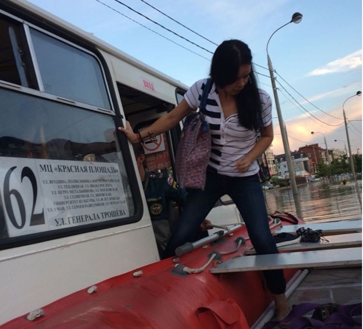 Автобус застрял в луже 16 июля на улице Московской. Для того, чтобы перевезти людей, спасателям пришлось использовать лодку. kuban24.tv »