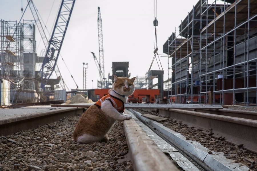 Кот Мостик, живущий у строителей моста через Керченский пролив, первым пройдет из Тамани в Крым, когда берега соединят автомобильными пролетами yuga.ru »