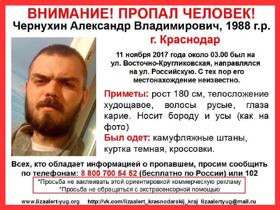 В Краснодаре пропал 29-летний Александр Чернухин yuga.ru »